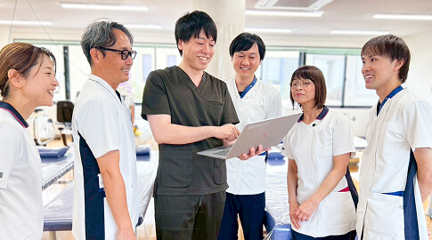 当院の理学療法士は、明るく親しみやすいスタッフばかり。病気やケガのことはもちろん、日常生活のお悩みなども気軽にお話しください。笑顔とチームワークで、前向きなリハビリをサポートします。